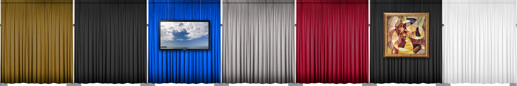 В наличии имеются драпировки высотой 3 м. Цвета ткани: черный, белый, серый, синий, бордовый, песочный.